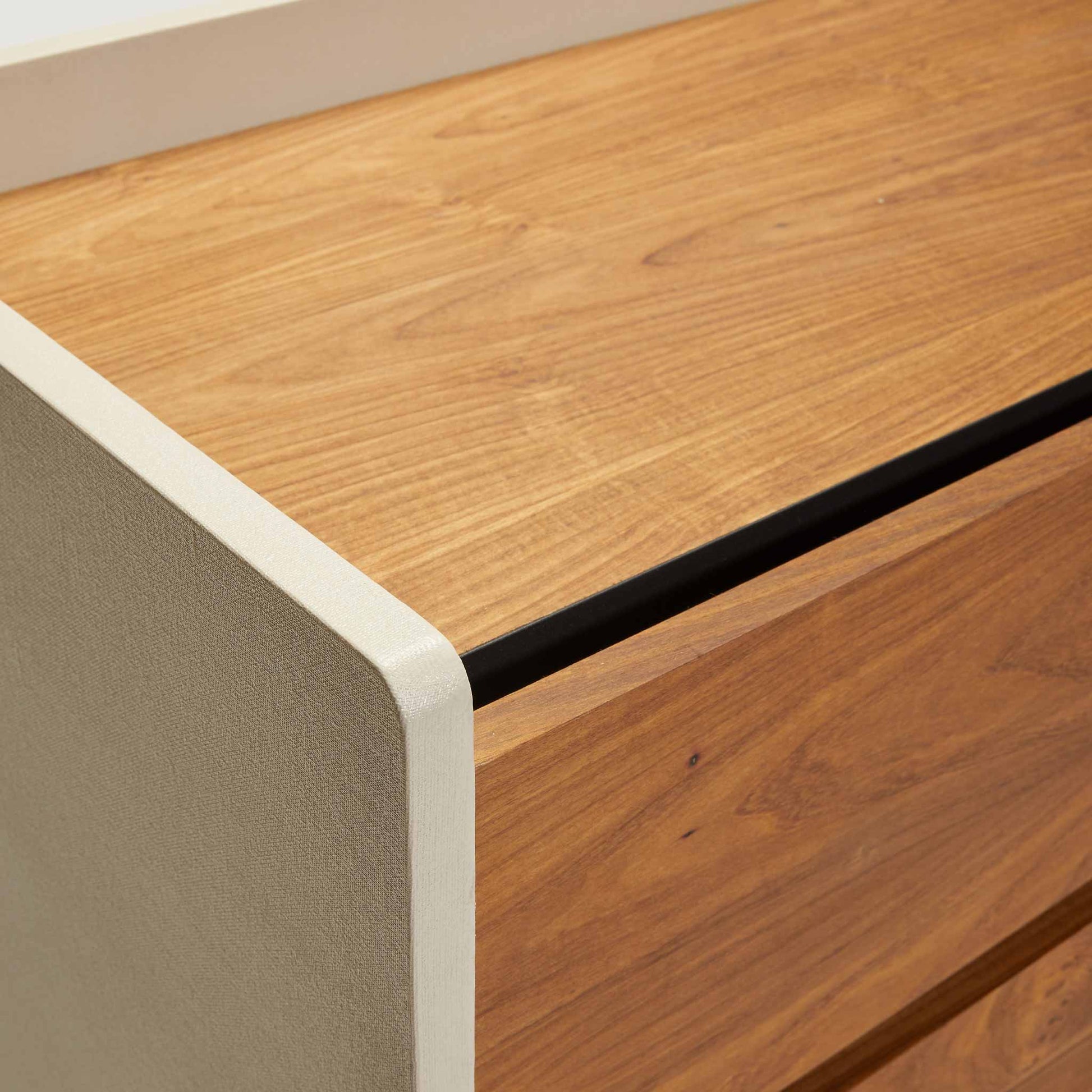 The top and drawer fronts are made of hand-veneered plywood with 100% natural petiribí wood, with a smooth but highly resistant water-based lacquer finish. The shell that covers the piece of furniture is a mono piece hand-lined with a fine 100% cotton gauze and a water treatment.
