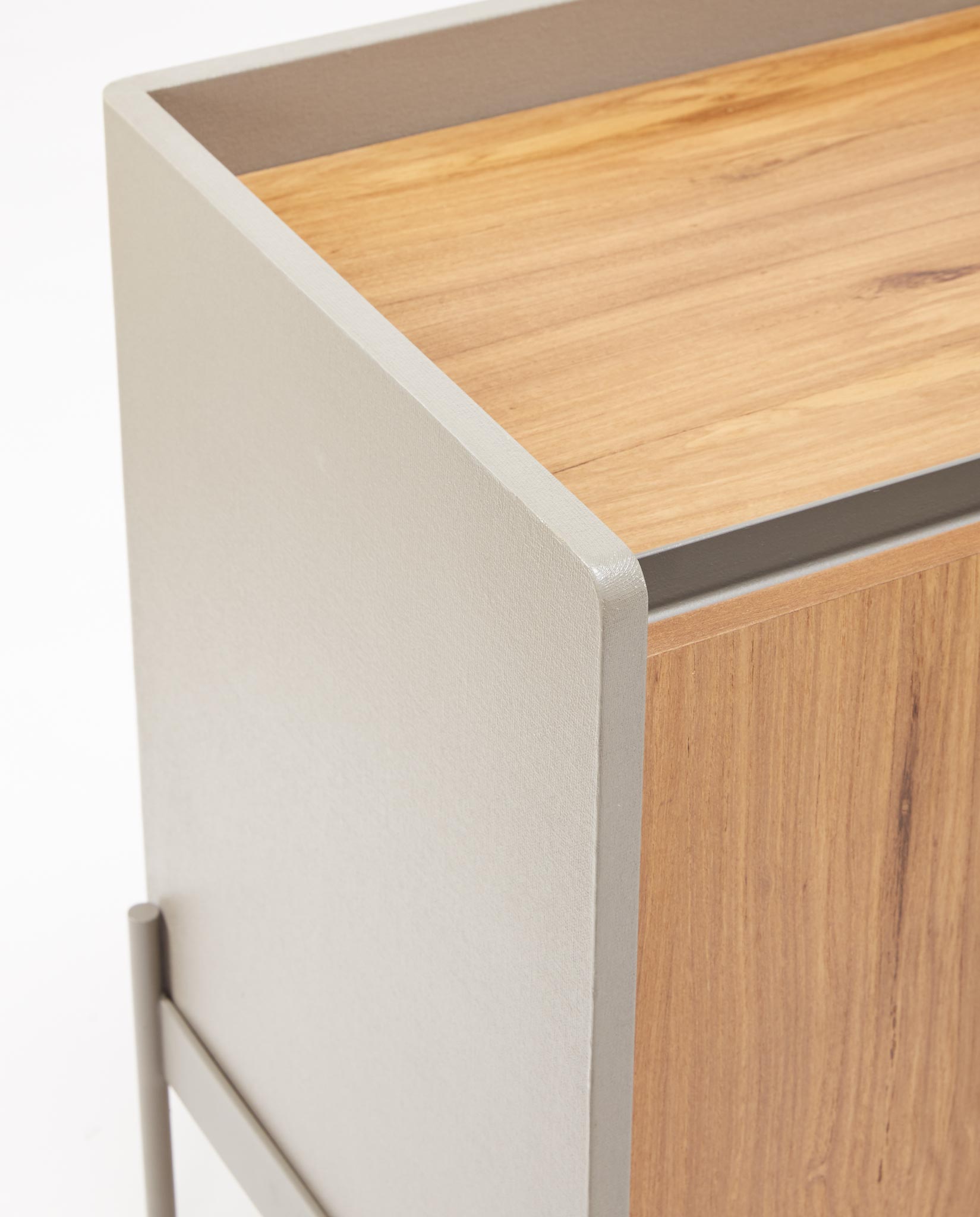 he top and door fronts are made of hand-veneered plywood with 100% natural petiribí wood, with a smooth but highly resistant water-based lacquer finish. The shell that covers the piece of furniture is a mono piece hand-lined with a fine 100% cotton gauze and a water treatment.